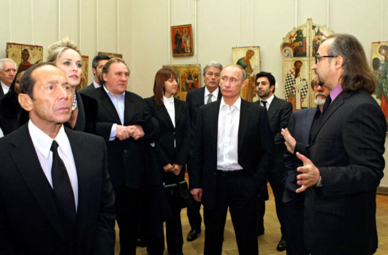 [Russian crooner Vladimir Putin eyes up Sharon Stone (standing next to Gerard Depardieu) in Russia on the day he sang at a charity event. Image via AP]