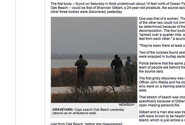 Four bodies were found at Long Island's Oak Beach, including one thought to be that of Shannan Gilbert, a 24-year-old prostitute who disappeared in May. Authorities believe the same person—or "team of people"—is responsible for all four.