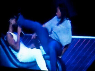 Usher brings a fan onstage to serenade her. Sexily, he takes her into his arms. Reclining, she grinds against him, then lifts her leg and flicks her foot over his head, stripper-style—only to kick him in the face.