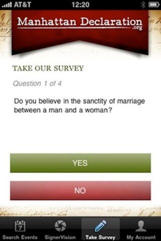 The fight over the "Manhattan Declaration" app, which asks users to pledge not to "bend to any rule purporting to force us to bless immoral sexual partnerships" like gay and lesbian ones, began when Apple approved the app for inclusion in its store earlier this year. The battle continued when the company removed the app over the Thanksgiving holiday under pressure from gay rights groups. Now the original authors plan to resubmit the app without the its featured quiz, which you could only pass by submitting "correct" anti-gay answers. GLAAD, meanwhile, is gathering signatures to pressure Apple to reject the revised app.