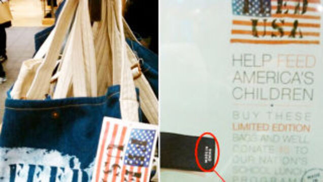 However, the FEED USA Denim Bucket bags are made in China, and should not have been connected to the made in the USA signs.