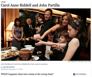 No doubt you are already familiar with the Times' edgy "Vows" column from Sunday, about the homewreckers? Carol Anne Ridell and John Partilla, who left their respective spouses for one another? It was very... well, something. I don't know. Weird. People were mad! So mad that Partilla is maybe thinking it was not a good idea to have his messy personal life be the subject of a big Sunday splash: