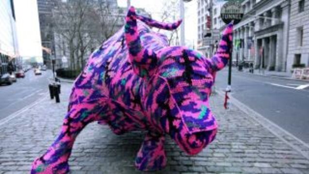 [Crocheting-obsessed artist Agata Olek covered the iconic Wall Street bull in a sweater this weekend. It only stayed up for two hours before being removed. Too bad, he could have used it in the snow! Image via Animal New York]