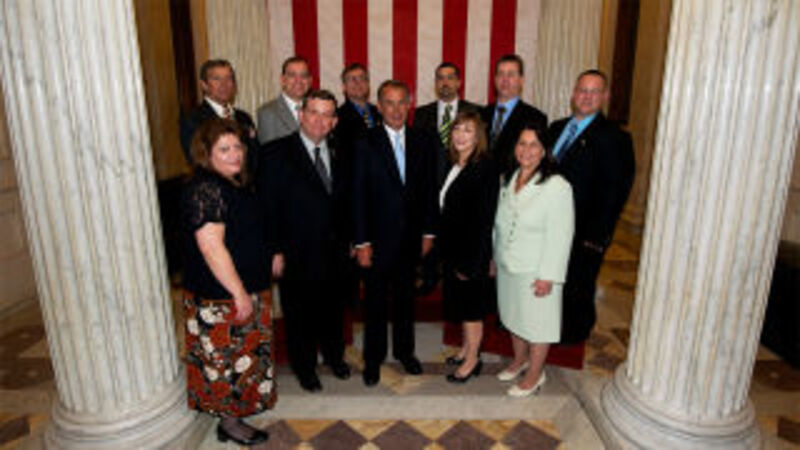 [It's a big Boehner day on Capitol Hill! Here's incoming Speaker John Boehner posing with ten of his eleven (less orange-skinned) siblings outside the House chamber today, before his swearing-in. Image via speakerboehner/Flickr]