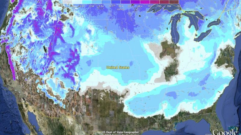 The map above, via Google Maps and the National Oceanic and Atmospheric Administration, shows snow cover and is shaded for depth. Below you can see maps of snow density and precipitation over the last 24 hours.
