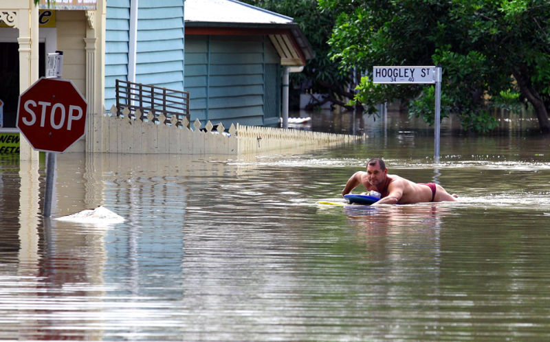 [A man in Brisbane, Australia paddles to safety on his surfboard as the flooded Brisbane River peaked at just under 15 feet today. Image via Getty]