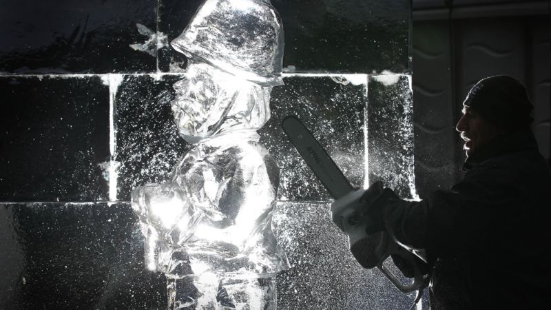 [An artist makes a statue of a British police officer during an ice sculpting competition in London today. Image via Getty]