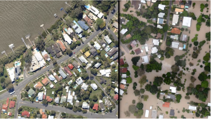 Australia's ABC News has put together a fascinating, and sort of terrifying, set of interactive before-and-after satellite photos of the apocalyptic floods in Brisbane, Australia. Above: The suburb of Fairfield. [ABC News]
