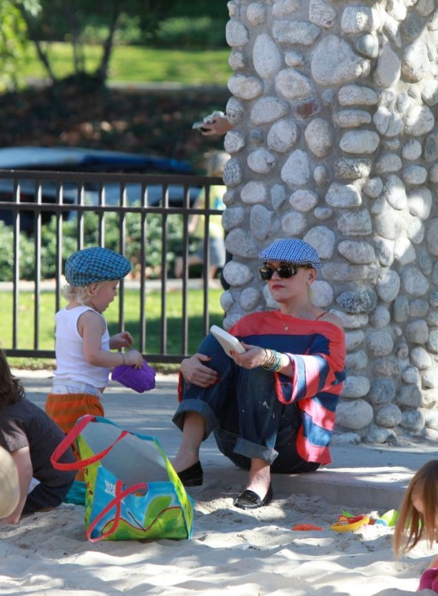 [Singer Gwen Stefani taking her kids to the park. And apparently forcing them to wear matching caps. Image via Bauer-Griffin]