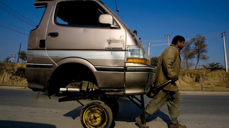 [A Pakistani laborer transports the front portion of a van through his handcart at a road in Rawalpindi, Pakistan. Image via AP]