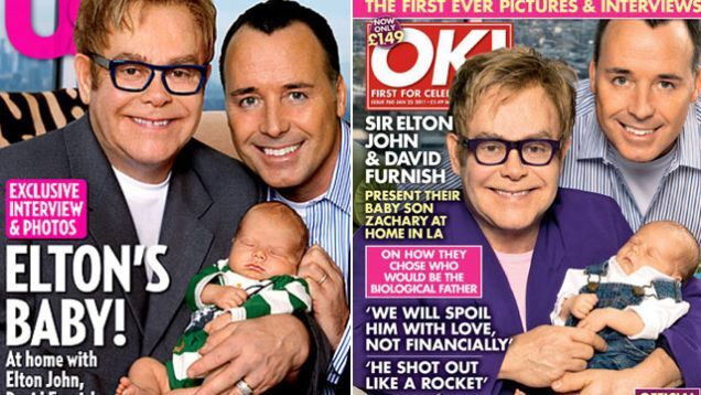 - Elton John and partner David Furnish's immaculately conceived surgogate-born babe Zachary Jackson Levon Furnish-John was born on Christmas day, and makes his public debut this week. (They're pulling a Travolta with simultaneous UK-US cover stories. This is the first time the phrase "pulling a Travolta" has been used in a context that does not include glory holes.) Quoth Sir Elton, age 63: "I've never felt anything like it in my life. You're so awestruck. What can you say? You take it in. The feeling, the joy, the warmth of his body, his breathing...I will never forget that experience ever." The fathers, who have been together for 17 years, say they are still trying to adopt a pair of Ukranian brothers—one of whom is HIV-positive—despite being barred from adoption at the last minute because they are gay. [Us, OK]