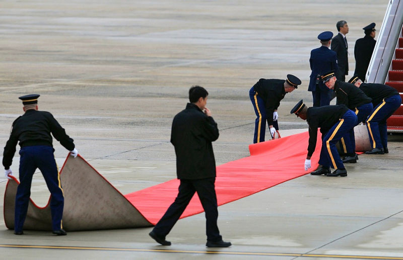[The red carpet is pulled into place to greet Chinese President Hu Jintao, who arrived at Andrews Air Force Base today and will meet with President Obama at the White House tomorrow. Image via Getty]