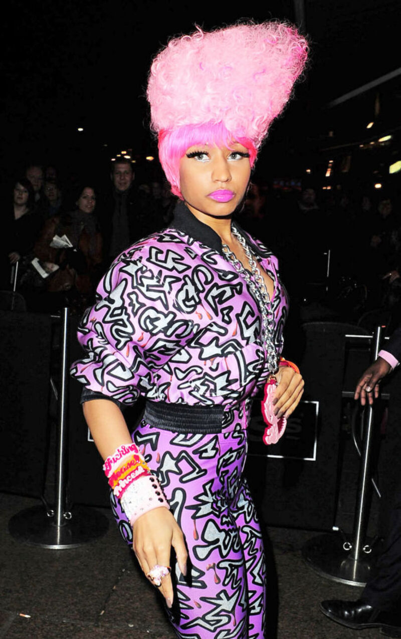 [At a visit to BBC Radio One, Nicki Minaj is a) Willy Wonka's new assistant; b) a Lisa Frank pencil with a pink eraser; or c) what celebrities will always be like post-Gaga. Image via Pacific Coast News.]