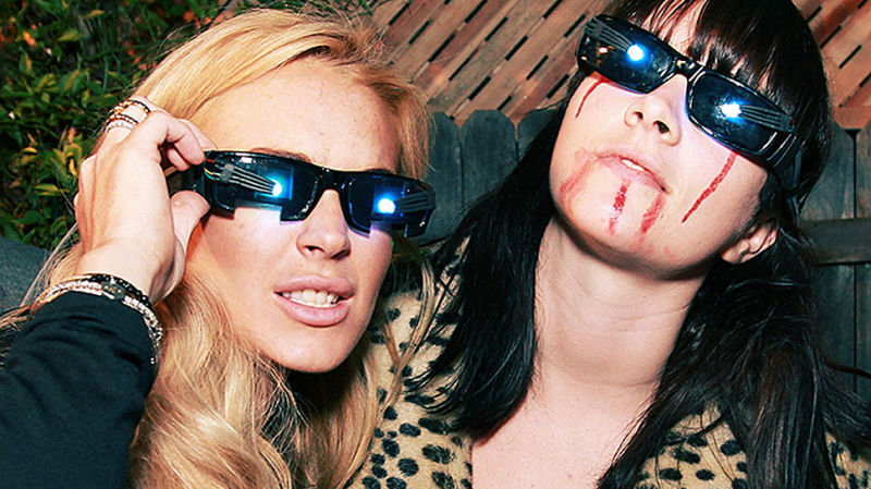 A sober Lindsay Lohan got high with her eyes, so talented is she at the art of altered states. The above party picture—at a horror-themed electronica birthday party—depicts LiLo wearing some sort of face contraption that is lined with tiny lights, allowing the wearer to close her eyes while the lights flash in time with music, resulting in a "tripped out effect." Sober Lindsay: Partaking in activities that normal people have to be stoned to find enjoyable. Though others at the party boozed, word is LiLo and neighbor/ex-girlfriend Sam Ronson stuck to Red Bull. [TMZ, Sans35, images via Sans35 Party Photography]