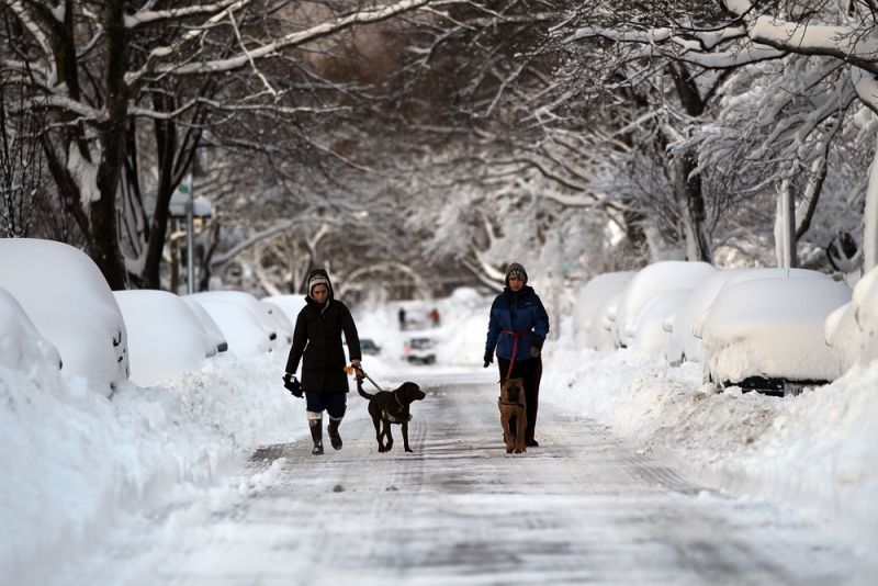 [The streets in Brooklyn were clear today for these women to walk their dogs in the road. More pictures of post-snowfall frolicking inside. Image via Getty]