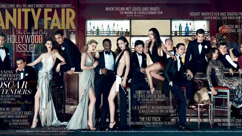 After getting some flack for a rather homogenous cover of white actresses last year, Vanity Fair's new Hollywood issue is mixing things up. There are 1.5 African-Americans on the cover! That's up from .25 African-Americans last year.