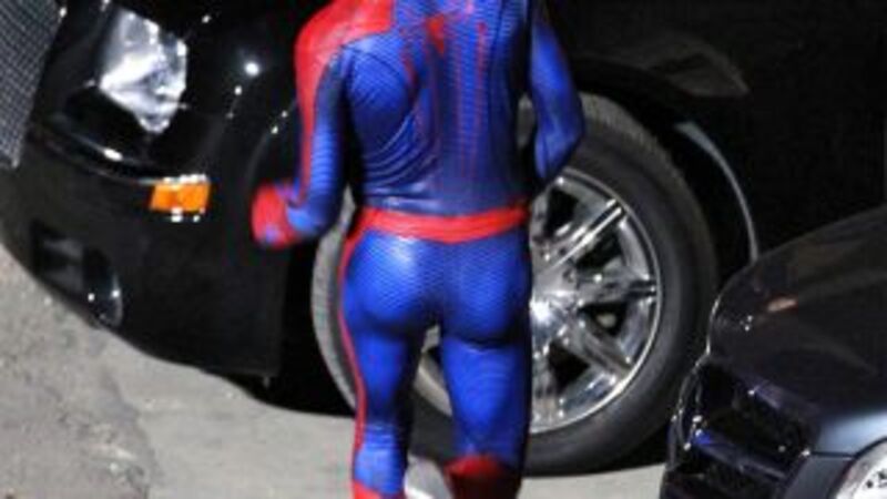 [Andrew Garfield (or some stunt double) looking fit on the Los Angeles set of the new Spider-Man movie. Photo via Splash]
