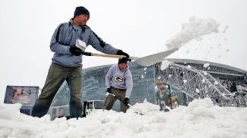 [The snow is everywhere! A storm in Dallas even attempted to ruin the Super Bowl. But clean-up crews at Cowboys Stadium will have the stadium ready for the big game on Sunday. Image via Getty]