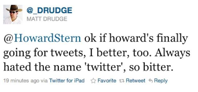 Matt Drudge, the famously reclusive editor of the Drudge Report, has joined Twitter. And just like that, he goes from running a website with a design from 1998 to a social-networking service that was the hottest thing in 2008.