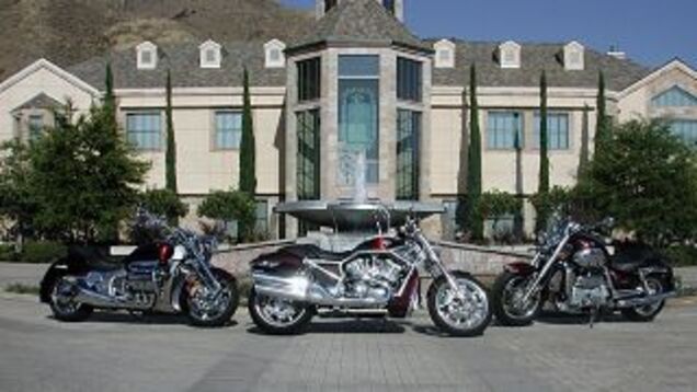 These motorcycles belong to Tom Cruise and David Miscavige, the leader of Scientology. Miscavige's is in the center; Cruise's Honda Rune is on the left and his Triumph Rocket is on the right. Those luscious, deep red tones were custom-painted by Scientology drones earning less than $1 an hour.