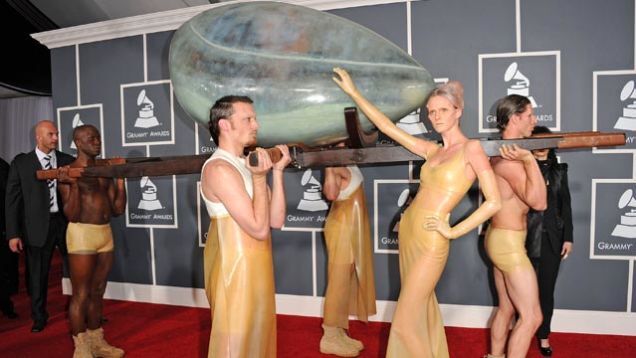 Lady Gaga arrived at the Grammys tonight inside of a translucent cocoon, carried on a litter by a troupe of shirtless gogo dancers. There was absolutely nothing remarkable about this. In fact, bystanders were surprised that the usually flamboyant Lady Gaga chose to wear such a run-of-the-mill outfit on the red carpet.