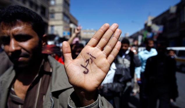 [A Yemeni anti-government protester wrote "leave" on his hand yesterday]