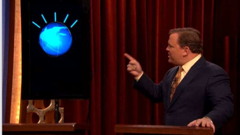 This week, when Watson wasn't destroying his human competitors on Jeopardy! he was working on Conan alongside Andy Richter. Last night, his taunts of sleeping with Andy's wife pushed Andy over the edge.