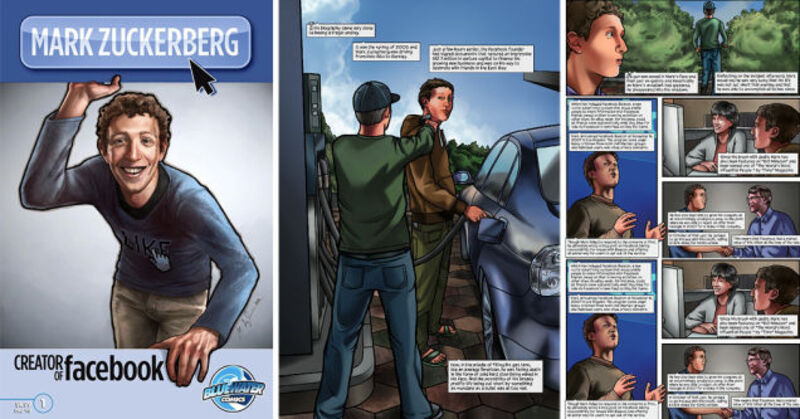 Canadian publisher Bluewater Productions has just published a 48-page comic book which tells the true origin story of Mark Zuckerberg. The center panel here depicts the time Zuckerberg was held up at gunpoint in 2005 while driving from Palo Alto to Berkeley. Of course, we all know what happened after that brush with danger: Zuckerberg built a bulletproof robotic exoskeleton in his basement and swore to devote his life to fighting crime. (Click to Enlarge)