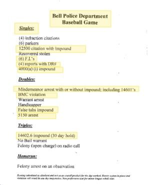 Hey, here's a new one: turn ticketing people and impounding cars into a fun game! A baseball game, and they'd keep score, and the officers could compete to see how they could extort the most money from civilians. What a suitably corrupt way to ensure that the maximum amount of revenue is squeezed from the populace to fund the enormous salaries of the crooks who run the city. And it would be extra awesome if they could put the whole scheme into memo form, to make things easier for the prosecutors who'd later be investigating the whole nasty business... oh, they did? Well then. Carry on.