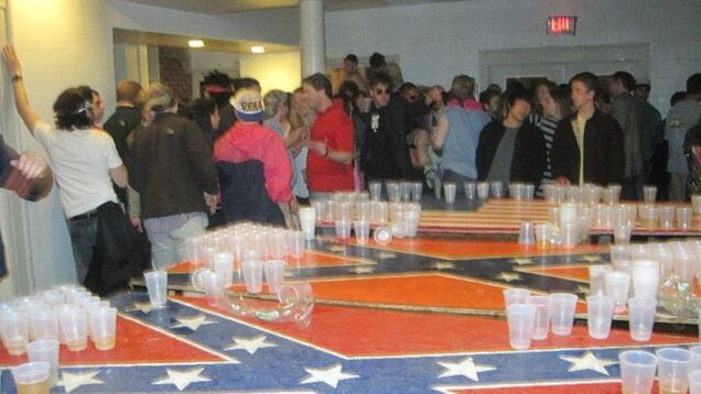 Oh, cool: at the University of Virginia law school there's a "Feb Club" that hosts themed parties throughout February. Then they put up party pics on their blog. Here's one from their latest bash: note the awesome Confederate flag beer pong tables.