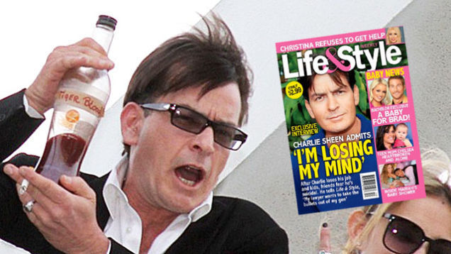 - Is Charlie Sheen's crazy train finally coming to a halt? "I'm really starting to lose my mind. I'm ready to call anyone for help," he apparently admitted to Life & Style. "I'm really trying to contain myself right now. My lawyer wants to come over to my house and take the bullets out of my gun." Has his mania finally broken, sending Sheen into a deep depression, or is this more unhinged rambling? Ranting crazy people are a bit like that truism about a room full of monkeys pounding on typewriters: If you wait long enough, they'll say whatever you want them to, eventually. Anyway, here are a bunch of other Sheen things in the news, for the 2.4 million of you who care: A rant about John Cryer; a rant about Women; some news about the fate of Two and a Half Men; a rant about the machete he was wielding the other day; and an update on his legal battle with Warner Bros. [L&S, image via Bauer-Griffin]