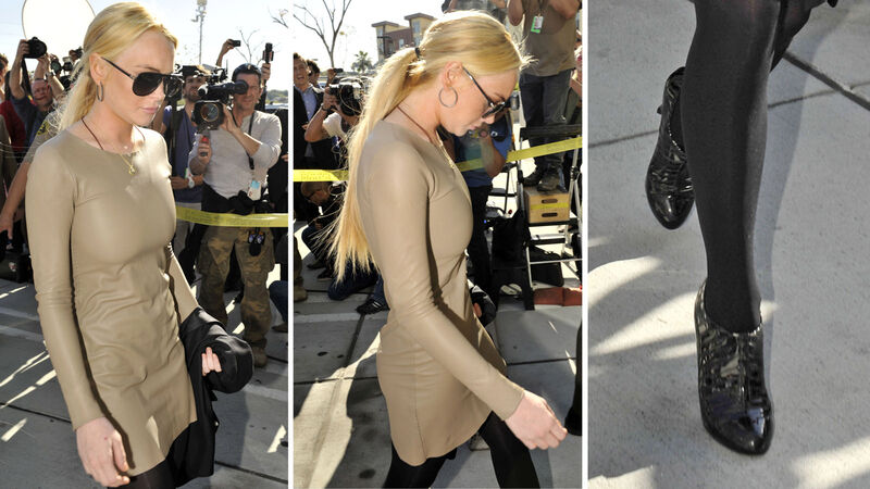 Lindsay Lohan arrived in court today 35 minutes late and in a tight tan mini-dress. (Is that leather?) At the hearing, she rejected a plea deal for the felony grand theft of a $2500 necklace. This means Lindsay is headed to trial! A whole trial's worth of LiLo court outfits! Think of the possibilities. (If you're thinking about going into the paparazzi business, now is a good time.) First, however, the court will convene on April 22 for a preliminary hearing where the prosecution will present evidence.
