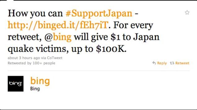 A social media genius at Bing decided the tsunami was a good way to boost their brand recognition on Twitter. This morning Bing tweeted: "How you can #SupportJapan -For every retweet, bing will give $1 to Japan quake victims, up to $100K."