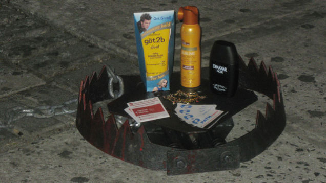 Replicating their "Hipster Trap," artists Jeff Greenspan and Hunter Fine set a "Bridge and Tunnel Trap" with hair gel, bronzer, a gold chain, and PATH train tickets in front of a bar on the Lower East Side. Snooki beware!