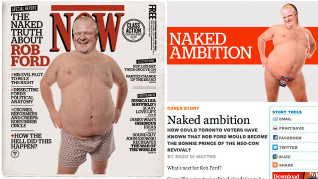 Toronto alt weekly NOW accompanied a story about Mayor Rob Ford's "naked ambition" with nearly-nude photo illustrations of the politician. (Ford's opponents Other politicians are portrayed as nearly-nude bodybuilders.) The morning the issue came out, the Toronto Star reports, the mayor's office launched a campaign to "remove and dispose":