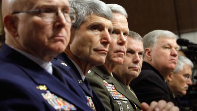 It seems as though Marine Corps Gen. James Amos (pictured, third from left), a onetime outspoken opponent of the Don't Ask, Don't Tell repeal, has had a change of heart. Where only recently he was testifying that letting gay soldiers serve openly would have a "strong potential for disruption at the small unit level," today he told the House Armed Services Committee that "the clear majority of [feedback] is very positive." Which means gay soldiers could serve openly as soon as this June. Ha! Suck on it, House Armed Services Committee.