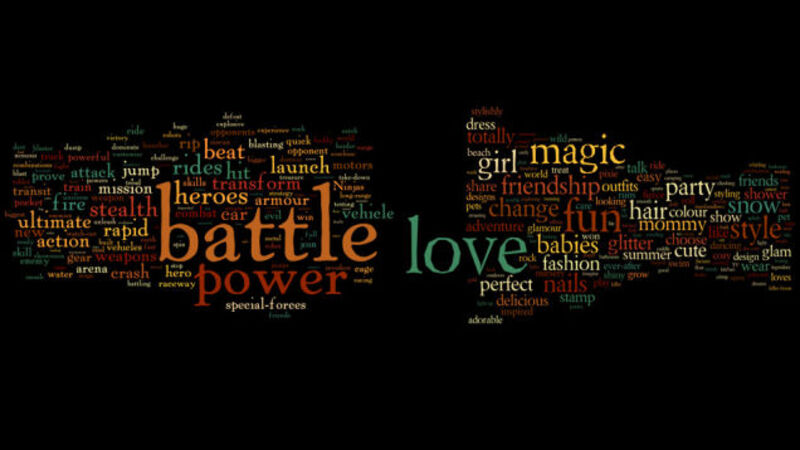 The Achilles Effect, a blog about gender stereotypes and masculinity, took stock of the frequency with which certain words are used in commercials for "gendered" toys like Hot Wheels and Bratz by making Wordle word clouds. See if you can guess which cloud goes with which gender! (Hint: Boys hate friendship, fun and glitter.) [Achilles Effect via Boing Boing]