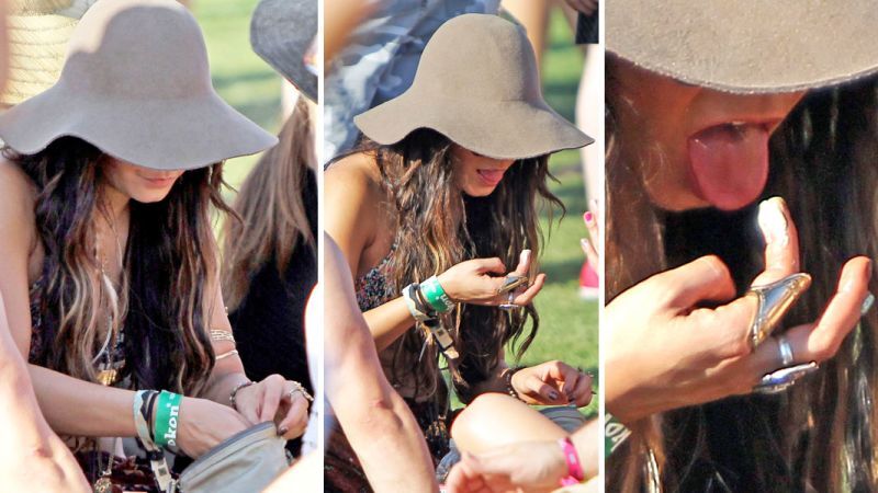 Disney star Vanessa Hudgens went to Coachella, where she pulled out a zippered pouch, reached inside, retrieved a mysterious white substance, licked it from her fingertip, and ignited a controversy: "Vanessa Hudgens Does Drugs at Coachella?" the internet asked. [Images via Pacific Coast News]