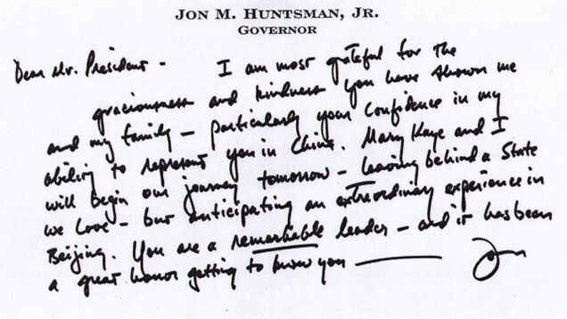 Or you can just read Amb. Huntsman's cute letter from August 16, 2009 here! If you can't decipher the illegible script up top, this is the text:
