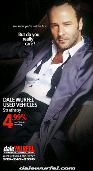 Here's an ad for Canadian car dealership Dale Wurfel, which seems to be trying to sell used cars with a little (unauthorized) help from fashion designer Tom Ford. The tag line: "You know you're not the first. But do you really care?" When you put it like that, no, we don't!