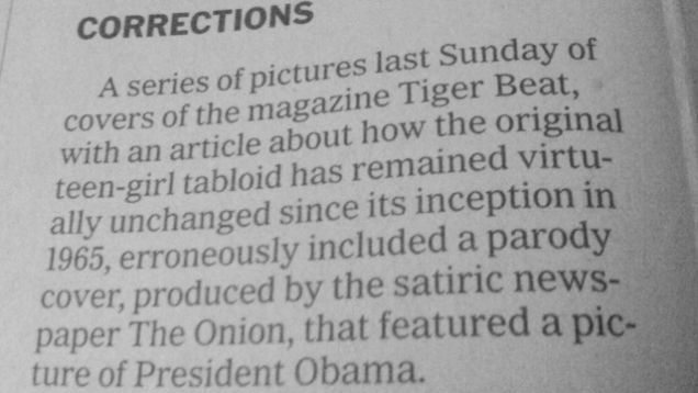 A series of pictures last Sunday of covers of the magazine Tiger Beat, with an article about how the original teen-girl tabloid has remained virtually unchanged since its inception in 1965, erroneously included a parody cover, produced by the satiric newspaper The Onion, that featured a picture of President Obama.