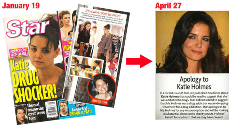 Katie Holmes' $50 million libel lawsuit against Star magazine has ended. In today's issue, Star apologized for a January story about how Tom Cruise and Scientology control Katie. Star says it "did not intend to suggest that Ms. Holmes was a drug addict or was undergoing treatment for a drug addiction." And Star's parent company, American Media, has made an "substantial donation" to an undisclosed charity in Katie's name.
