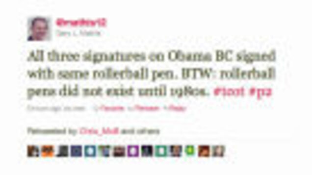He is a "Conservative, gun owning scientist with a Ph.D. in Physics who believes in the free market & that Dems & Libs should be shown no mercy in the political arena." See that? "Ph.D. in Physics"? Well, now you know for certain that Obama's long-form birth certificate isn't real, because it was written with a pen from the future. Get your "layers" argument out of here — Mathis has a professional argument. Other popular Mathis tweets from today include "I P Freely on Obama's BC" and "Let me say this one more time for dim witted libs: rollerball is not the same as ballpoint. Got it? NOT THE SAME!"