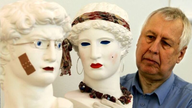 Hans-Peter Feldmann (pictured, at right) won the $100,000 "Hugo Boss Prize" last year, for being a good artist. Looks like you miscalculated, Hugo: Hans-Peter is totally sticking all of your money to a wall.