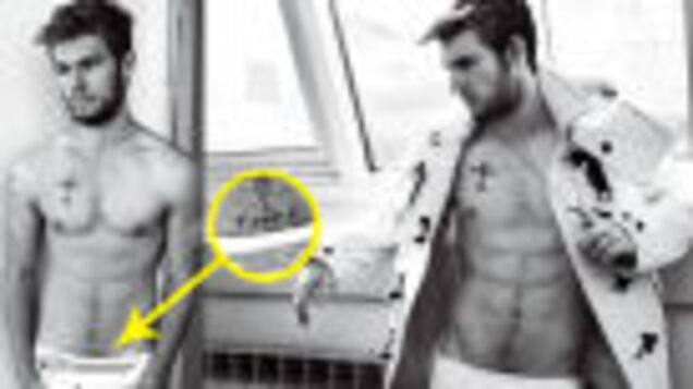 This morning we heard that "psycho loose cannon" actor Alex Pettyfer has "Thank You" tattooed above his penis, "in case I forget to say it." Now V Man, the magazine that quoted Pettyfer on that, has kindly provided photographic evidence of said crotch tattoo. Unfortunately, since the web versions of their photos are kind of small. I feel like I'm squinting at a too-small line of text at the opthamologist's office.