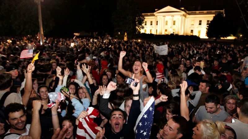 Last night as news of Osama bin Laden's death was announced to the nation, crowds in New York and D.C. rushed to Ground Zero and the White House to celebrate. Here are some photos of the revelry.