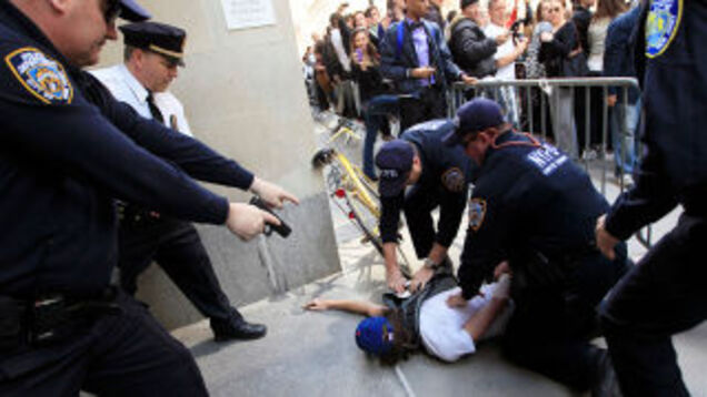 New York City police officers tackled and took away for questioning a "suspicious man" outside Ground Zero today, where President Obama was leading a wreath-laying ceremony. The man was walking his bike towards the World Trade Center area and saying, "Secret Service, Secret Service coming through," after which cops tackled him and searched through his messenger bag. And according to the New Jersey Star-Ledger, "witnesses say may have pulled a gun out of a backpack as President Barack Obama's motorcade passed."