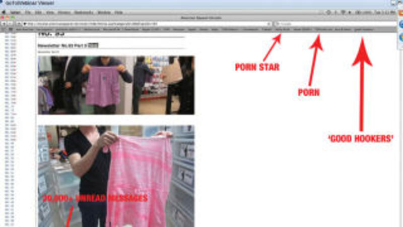 During a web conference with American Apparel store managers today (topic: "store summer-ization and shitty sales in the Midwest") Dov Charney opened the browser on his personal computer. One participant took a screengrab and sent it to us. Above, an annotated guide to Dov Charney's desktop, featuring the following: