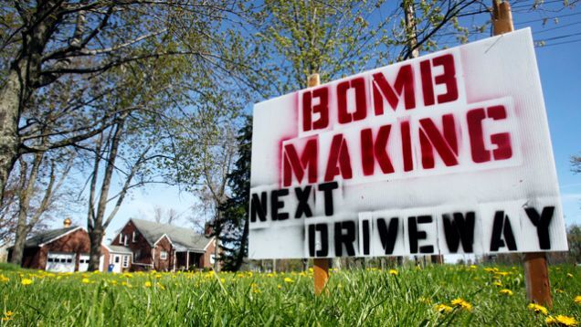 What say we check the headlines for a new installation of that old segment, Morons With Signs On Their Lawns, hmm? Let's see here... well look at that, it's a moron with a sign on his lawn! Michael Heick of Amherst, New York — the moron — lives next to a mosque, but can't stand their flashy lights. So the sign he's put on his lawn says, "BOMB MAKING NEXT DRIVEWAY." Take that, fuckers!