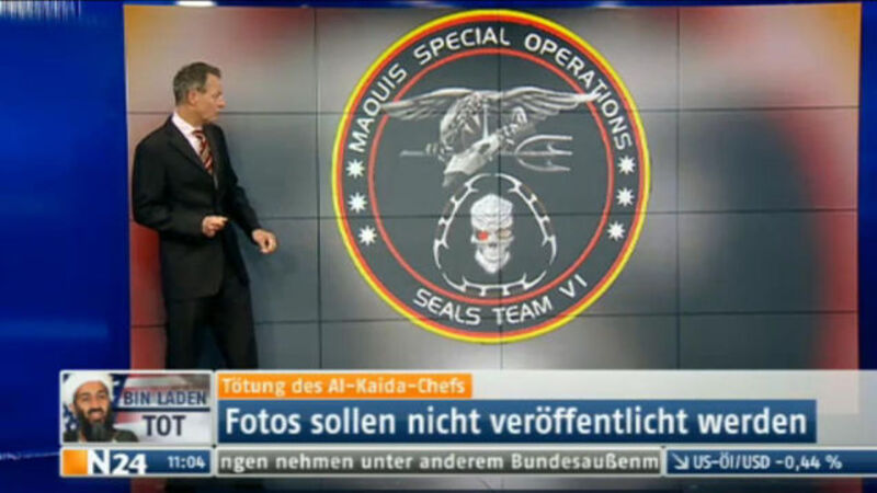 Who killed Osama Bin Laden? Why, anti-Cardassian rebels fighting in former Federation colonies, obviously. Didn't you catch the broadcast on German channel N24? The news organization seems to have pulled a fan-made logo for the "Maquis Special Operations," a rebel terrorist group featured in Star Trek: The Next Generation, and presented it as the emblem for the Navy SEAL group that shot Bin Laden in Pakistan. Host Mick Locher even analyzed it! "And they also have the ‘Team Six,' that carried out the mission," he noted. "They don't have the skull in their emblem for nothing." Well, not, they don't, it's just that the skull, as close examination will reveal, is a Klingon skull. [TrekMovie.com via Fox News]